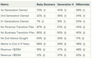 •Ownership Longevity: 70% of Baby Boomer businesses have been owned by their family for only one generation. Multigenerational ownership is more common among Millennials (20%) and Generation X (16%), but still represents a minority.
